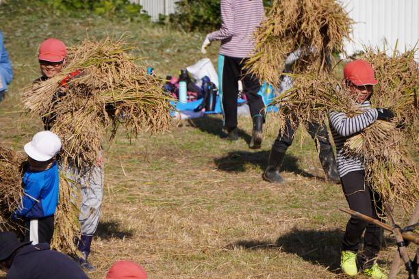 【1年生、刈った稲を保護者や5・6年生に預けます】