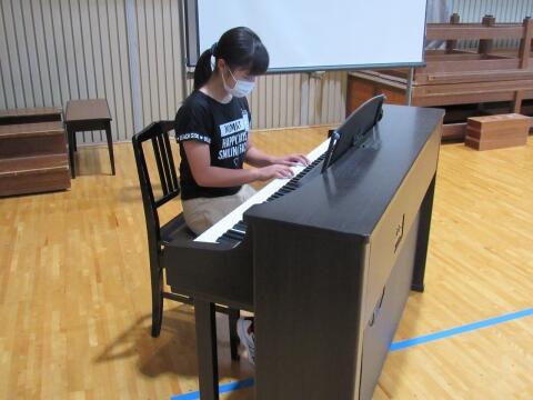 いつも伴奏をしてくれる6年女児。「ノーミスだったね!」の声かけに、「はい、今日は鍵盤に止まった蚊も撃退しつつ弾けました!」とのこと。たのもしーい‼