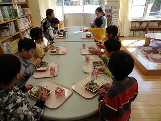 6年生は、家庭科で調理実習をしました。6年間の感謝を込めて保護者の方々に「手作り弁当」を作りました。弁当箱には、わかめご飯、きんぴらゴボウ、ベーコン巻きなどが入っていました。最後に保護者の方々と会食をしながら、6年間の思い出を語り合っていました。
