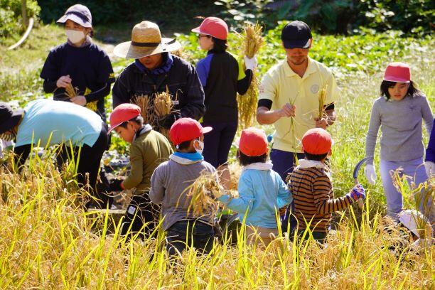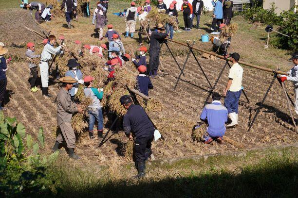 【1年生、刈った稲を保護者や5・6年生に預けます】
