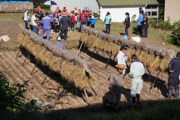 【刈り残しや束から落ちた稲も大切に】 【稲干しの組立(大人のお手本)】