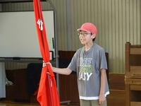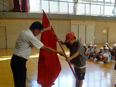 次に、団の色決めを行い、その決定した色の団旗を校長先生から両団長授与していただきました。その後、両団長より堂々とした立派な挨拶があった後、各団での声出しを行いました。