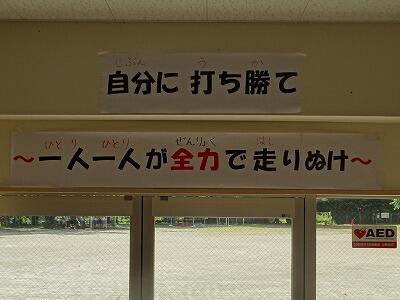 まず、代表・環境委員会の児童から、今年度の大会スローガンの発表があり、今年度のスローガンは児童が一生懸命話し合って決定した「自分に打ち勝て~一人一人が全力で走りぬけ~」の紹介がありました。