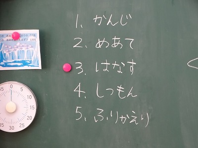 ある先生の黒板を見ると、授業1時間の大まかな流れを説明したり明示したりして授業を始めています。児童にとっては、見通しをもてることになり「何をすればよいか」が分かった上で学習内容を追求できることになります。