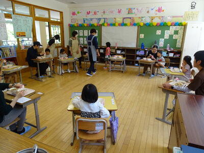 体の健康がわかれば・・・心も同時に満たす給食が近づきます。今日は、1・2年生の保護者11名が来校され、給食試食会が実施されました。特に1年生は、いつもと違うランチタイムに、うれしそうな様子。2年生では、ある保護者が「家庭とは違った表情で、少したくましくなった姿が見られました」とのこと。