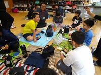 今日も村内の小学生が集まり、普段できないような体験的な学習、協働的な学習が行われています。3年生は、スコップで砂をすくい、重さを体感することで数量を学んでいました。