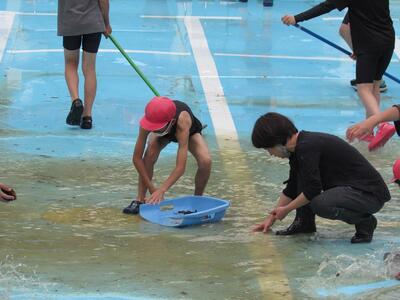 気温23度、時折涼しげな風が吹く中、今年の水泳学習が始まりました。本校プールは沢からの山水を利用しているので、水温が低くなりがちなのですが、ここ数日、その山水が止まってしまっていたため、子ども達曰く「おっ、ぬりぃ!