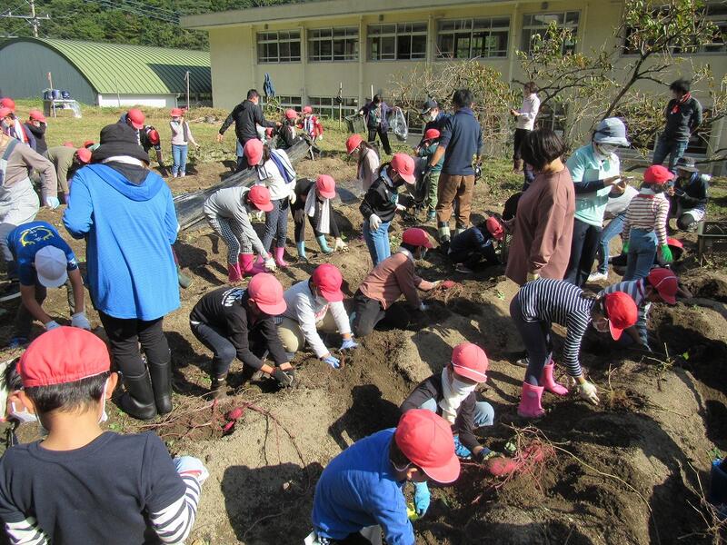 PTA生活指導部の皆様のバックアップで、今年行っていた芋の栽培。今日はいよいよ収穫作業です。大きい芋が獲れるかなあ、たくさん獲れるかなあ…とわくわくしながら全校児童で取り組みました。