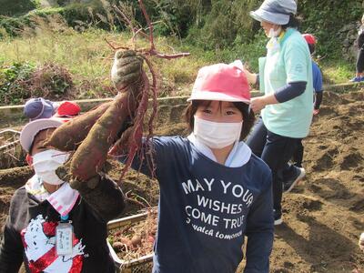 コンテナ6個分の大収穫に子ども達は大喜び。芋ごはん、天ぷら、スイートポテト…、何にして食べようかなあ。今週末は、家庭で親子料理教室が開催されることでしょう。