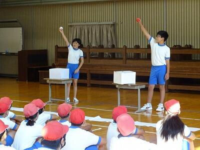 進行は児童主体で、2名の団長が自己紹介をし、色決め行って赤・白が決定しました。その後、校長先生から団長に団旗を授与していただきました。