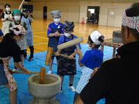 講師の先生の手ほどきで、石臼の中に入ったひえを杵でつきました。最初は、ひえつき節のリズムに合わせることが難しかった子どもたちでしたが、徐々に上手になっていきました。