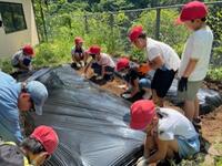 今日(5月15日)の朝早く、地域の方が畑を耕して畝を造ってくださいました。そのおかげもあり、2時間目に2年生と担任の先生、校長も一緒に、きゅうり等の野菜の苗を楽しそうに植えてくれました。