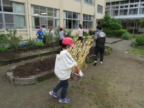 花の植え替えをするために、今朝は全校児童総出で学級園の草抜き、耕しを行いました。梅雨の合間を縫って、久しぶりの戸外での活動にみんな大はりきりです。