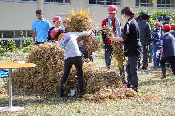 【1年生、刈った稲を保護者や5・6年生に預けます】
