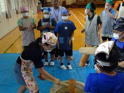 講師の先生の手ほどきで、石臼の中に入ったひえを杵でつきました。最初は、ひえつき節のリズムに合わせることが難しかった子どもたちでしたが、徐々に上手になっていきました。