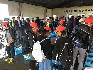 2日目は、社会科見学として、学校近くの庵川漁港見学。その後学校に戻り、体育、総合的な学習の時間、音楽などの学習を草川小の皆さんと一緒にします。