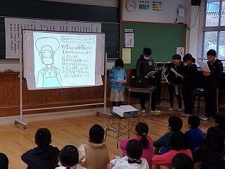 保健・給食委員会の児童による、給食の大切さを伝える紙芝居(スライドショー)