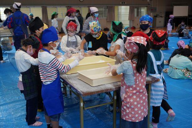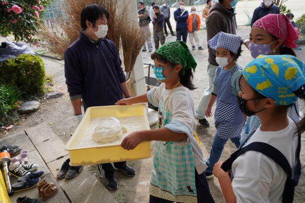 田植えから稲刈り・脱穀まで、子どもたちも手伝いながら育ててきた餅米を、蒸し器で蒸して、石臼(いしうす)と杵(きね)で、餅にしていきます。もちろん、この日の給食は、ありません。ごらんのとおり、しょう油やきなこを付けて、みんなでいただきます。