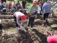 10月17日(火)の午後、5月に植えたイモの収穫を、全校児童とPTA生活指導委員会の保護者の皆様で行いました。