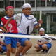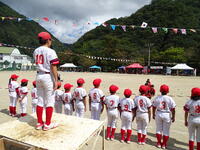 午後のプログラムスタート前には、スポーツ少年団の行進と紹介がありました。両クラブとも、大きなかけ声とともに整然とそして堂々と行進してくれました。両主将は、クラブの紹介をしてくれました。