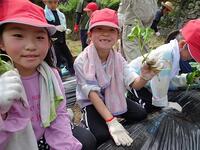 初めての1年生は少々緊張気味だったようですが、大勢のみなさんに教えてもらいながら、心を込めて苗植えをしているようでした。