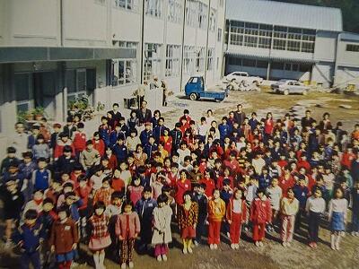(写真:100周年記念式典頃の椎葉小の子どもたちと先生方)