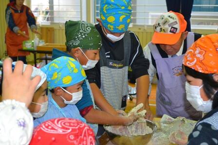 石臼を使ってそばをひきます。地域のそば打ち名人さんに「蕎麦の先生」として来ていただき、グループごとに分けて指導をしていただきました。