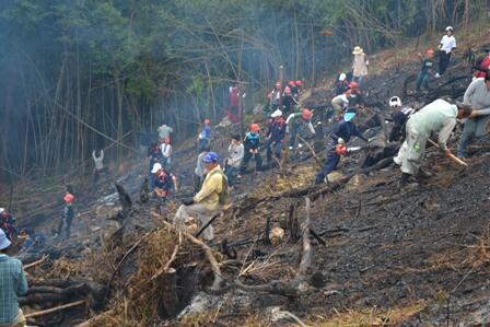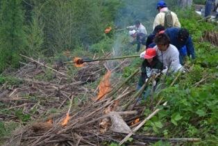6月29日と7月28日に実施しました。焼き畑にする斜面のやぼを切ったり、周りに人が通れる、そして他に火が燃えうつるのを防ぐためのを作ったりしました。