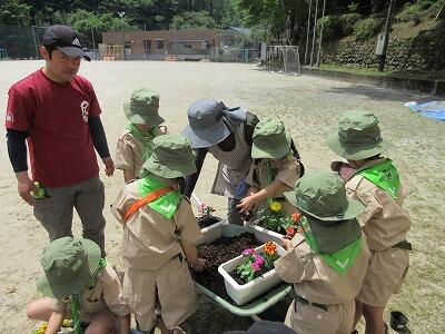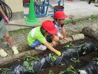 5月に1・2年生が植えたさつまいもが大きく育ったので、いもほりを行いました。尾向保育所の園児も一緒に活動をしました。大きなさつまいもを見つけては、歓声を上げながら掘っていきました。