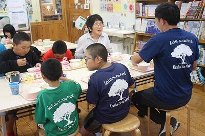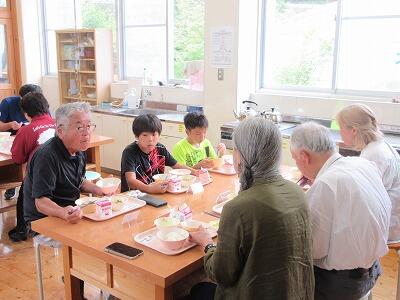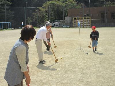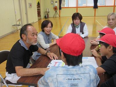 今日は、高齢者の方々を学校にお招きして、交流会を開きました。グランドゴルフ、ラダ―ゲッター、お話や質問などの活動を通して交流を行いました。給食も一緒に食べていただきました。普段より多い配膳になったので、保護者(家庭教育学級役員)の方々にもお手伝いいただきました。