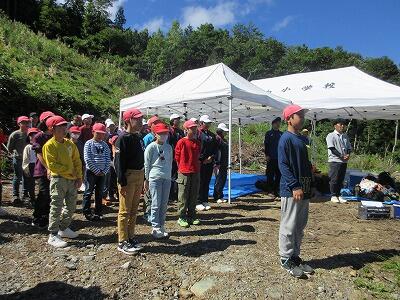午前中は植樹、午後からは記念式典に参加しました。時々雨が降る中での植樹となりましたが、桜や梅の苗木を全員で200本植えることができました。午後からの記念式典では、実践発表や記念講演を通して、椎葉村のよさに改めて気づいていたようでした。最後に、子どもたちが大会宣言を行い「これからも環境を守り続け、文化と伝統を引き継いで、世界のモデルとなる村になるように学び、行動しましょう。」と宣言しました。
