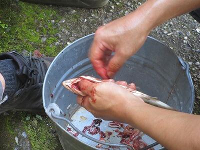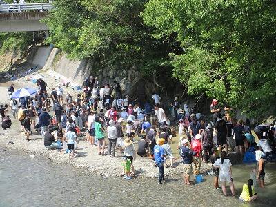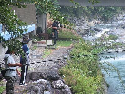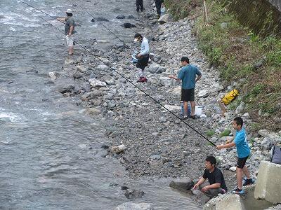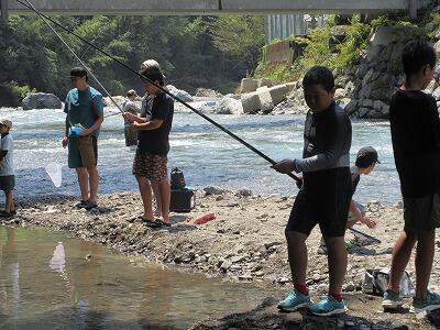開会式・神事を行った後、7時から釣り大会が始まりました。村内外の方々が大勢集まり、釣りを楽しみました。今年は釣り体験も行われ、小学生も釣りを楽しみました。午後からのつかみ取り大会では、たくさんの子どもたちが、持ちきれないくらいたくさんのエノハやマスをとっていました。