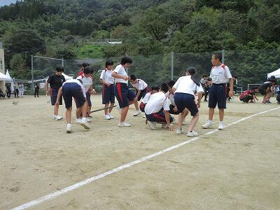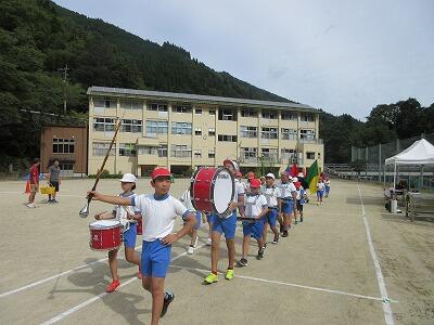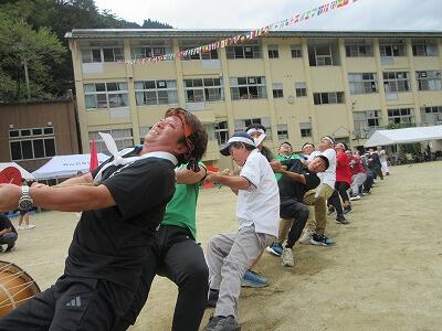 雨が心配されたので、プログラムを入れ替えながら実施しましたが、無事すべての種目を予定どおり行い、盛大に盛り上がりました。子どもたちは、地域の方々からたくさんの応援をいただき、全力で競技に取り組みました。保護者・地域の方々も親子団技や綱引きなど、楽しく真剣に参加くださいました。また、青年団や中学生は、各競技の用具準備などに協力いただきスムーズな運営となりました。尾向地区が一つになった運動会でした。