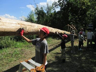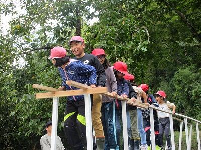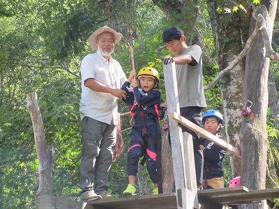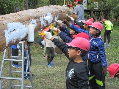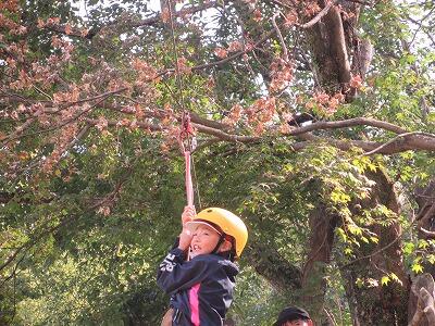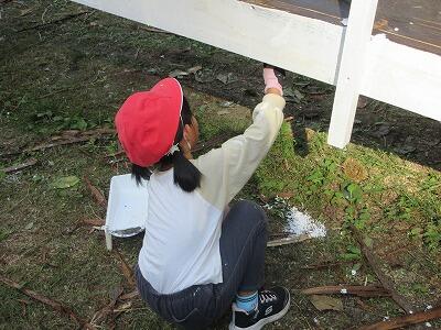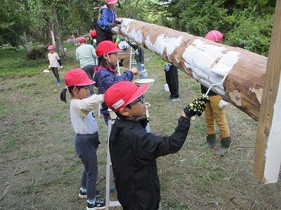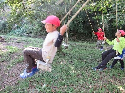 今日は学校跡地にある森の遊園地に行きました。巨大シーソーづくりやジップライン、ブランコ遊びなどをしました。まず、全長30mくらいのシーソーに、はけやローラーでペンキを塗る活動をしました。その後のジップライン体験では、スピード感と浮遊感が何ともいえず楽しかったようで、また乗りたいと興奮気味に言っていました。最後に、全員で巨大シーソーに乗って遊び、自然の遊具遊び体験を満喫していました。