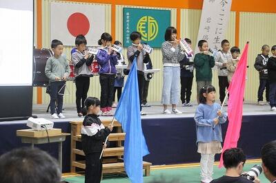 多数の来賓の皆様をお迎えして、保護者・地域の方々にも多数ご参加くださり、盛大に150周年記念式典を開催しました。子どもたちの発表では、「大好きな学校、大好きな地域」との思いをことばや歌、合奏で伝えました。その後、尾向小学校で勤務された先生からの講話がありました。尾向の昔話を発掘したり、歌をつくったりされた当時のお話をご講演いただきました。また、作った歌に込められた思いについてもお話しくだり、実際歌ってくださいました。今でも歌い継がれているので、子どもたちや保護者にもなじみがあり、会場のみんなで歌いました。