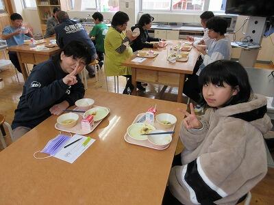 2~4校時には各学級の参観授業や学級懇談を行いました(今回は全ての学級で複式指導の様子を見ていただきました)。保護者の皆様に、この一年間の子どもたちの成長や今後の目標などについて見たり考えたりしていただきました。給食時間には、5・6年生の親子給食を行いました。6年生にとっては最後の親子給食でした。家族で楽しく過ごすことができたようです。