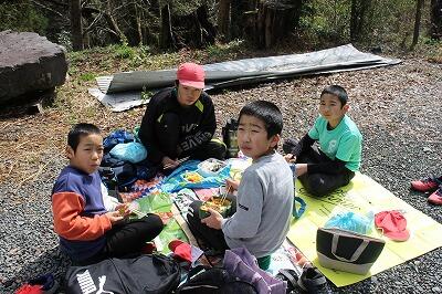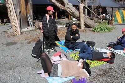 その後、森の遊園地(学校跡地)に向けて出発しました。予定では、森の遊園地で楽しく遊ぶ予定でしたが、昨日の雨で入ることができませんでした。そこで、いつもお世話になっている尾前一日出さんの事務所(森の遊園地のすぐ下)をお借りして昼食と宝探しをしました。友達と楽しくお弁当を食べたり、恒例の宝探しを思い切り楽しむことができました。