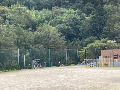 写真は、尾向保育所の子どもたちが運動場で遊んでいる様子です。運動場一面に散乱していた葉っぱは学校職員で片付けました。子どもたちが元気に遊ぶ様子を見ると元気が出ます。