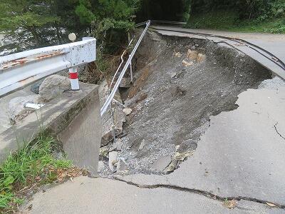 1.教職員住宅近くにあった小原橋が消失しました。教職員住宅に住む5名の職員とその家族は毎日この橋を使っていました。横にあった道路も崩落し、この上にある集落の皆さんが孤立していらっしゃるようです。早期の孤立解消を願います。↓