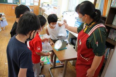 はじめに、休日に食べたお菓子を振り返り、砂糖や塩分、脂肪分がどれくらい含まれているかを考えました。その後、朝食・昼食・夕食で足りない分をおやつで補うという考え方を教えていただき、これから気を付けることを考えました。また、「おやつ=お菓子」ではないということも学びました。