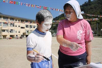 1・2年生の発表はドラマ仕立てになっており、芋掘りを邪魔する「いもいも大魔神」から、計算や縄跳び、音楽などの力で芋を取り戻すというストーリーでした。それぞれの発表がとても上手で、1・2年生の仲のよさも感じられました。