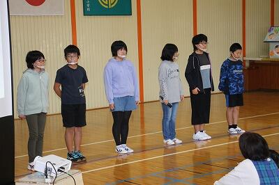 6年生は、昨年9月に尾向地区を襲った台風14号のことを作文で発表しました。台風が近付いて不安だったこと、停電でたいへんだったこと、消防団の人たちが復旧作業をしてくださったことなどを発表し、自分も世の中の役に立つ人間になりたいという決意を述べました。とても立派な発表でした。