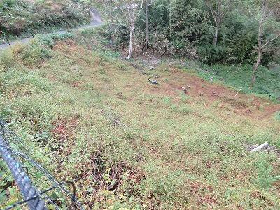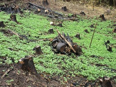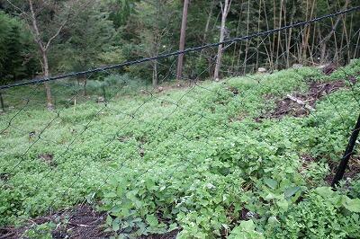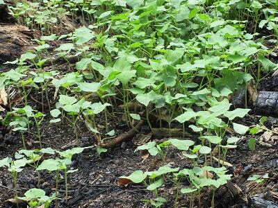 7月23日に火入れ、そばの種まきをしてから、2週間たちました。雨が少なくどうなっているか気になっていましたが、一面に緑色の芽を出していました。