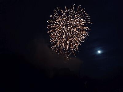 夜空には大きな花火、渓谷に響く音。迫力がありました。