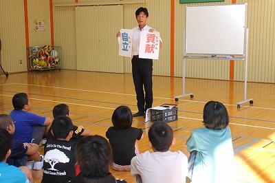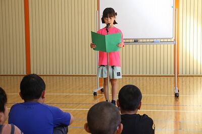 始業式では、まず、児童が夏休みの思い出や2学期がんばることを発表しました。その後、校長から、夏休みの『自立・貢献』の取組や、新千円札の「北里柴三郎」についてのお話がありました。最後に、学習・生活・健康面についてそれぞれの担当から話がありました。