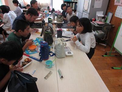 10月7日は、ソバの収穫が延期となったので、給食は持参した弁当となりました。「お弁当の日」に設定していましたので、おかずの一部を作った子、盛り付けを行った子など、それぞれの家庭で弁当作りに挑戦しました。