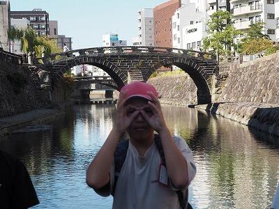 班別自主研修では、日本最古の石造アーチ橋「眼鏡橋」も見学しました。
