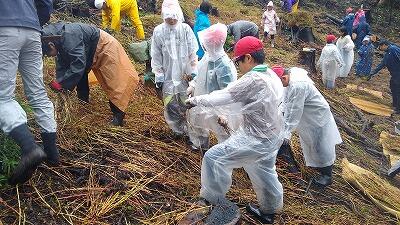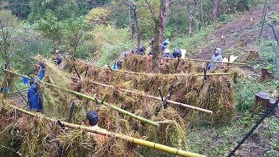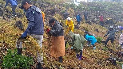 7月23日の火入れ・種まきから91日経った今日、ソバの収穫を行いました。雨の中での活動となりましたが、子どもたちは合羽を着て、一生懸命に収穫体験を行いました。1~3年生ははさみ、4~6年生は鎌を使って刈り取っていきました。収穫祭では、おいしいソバが食べられそうです。