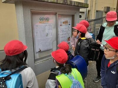 写真は、朝の登校風景です。今月の詩が掲示してある掲示板の前で声に出して読んでいます。