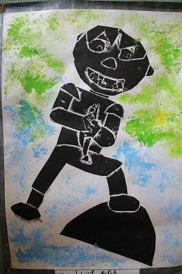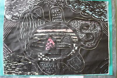 1・2年生は紙版画です。紙からはみ出すくらい迫力のある作品ができました。1・2枚目が2年生、3枚目以降が1年生です。
